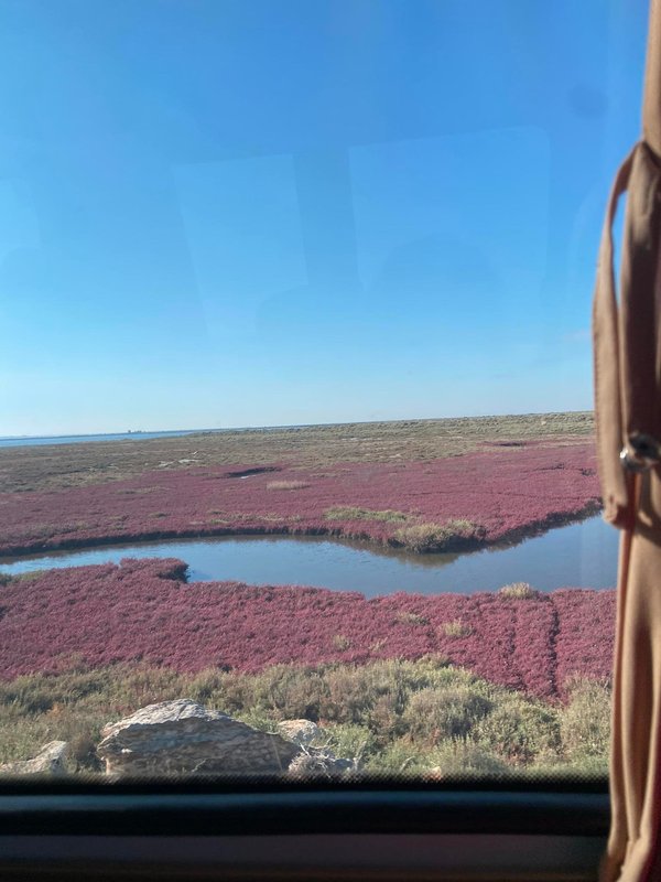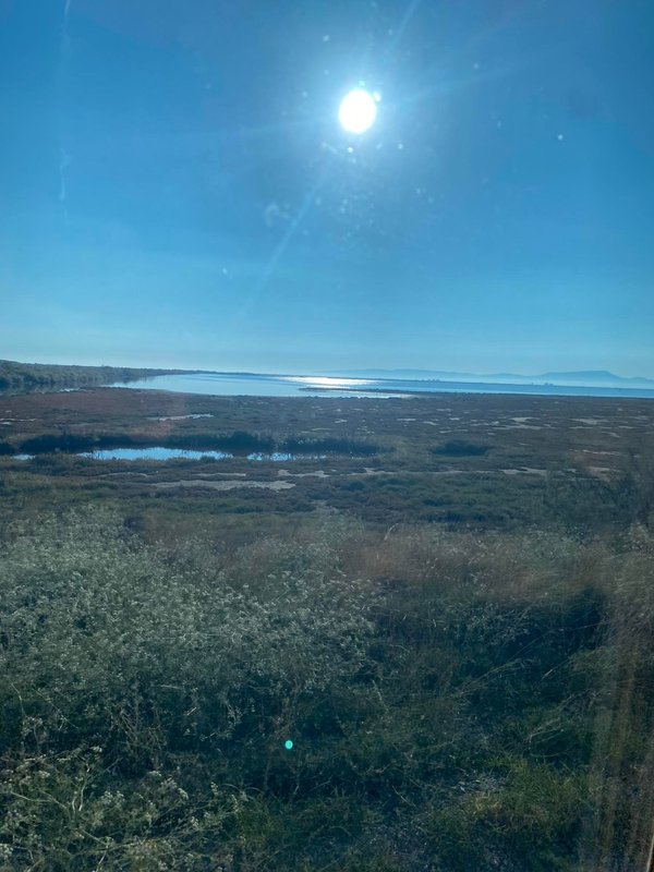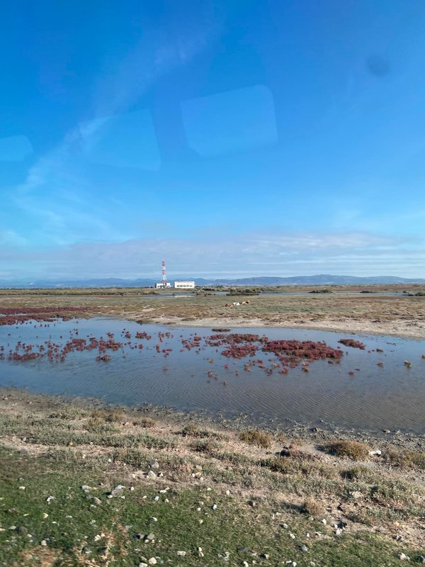 Στη διαδρομή, η άγρια ομορφιά της ελληνικής φύσης σε συνεπαίρνει. Ήταν τέλη Σεπτεμβρίου και οι αρμυρήρθες που το φθινόπωρο παίρνουν ένα βαθυκόκκινο χρώμα, σκέπαζαν τις όχθες των λιμνοθαλασσών και τους αλμυρόβαλτους. Έξω από το παράθυρο, η ματιά μας άγγιζε -σχεδόν ευλαβικά- έναν περίτεχνο πίνακα ζωγραφικής, από αυτούς που η φύση ξέρει να φτιάχνει με τον πιο αριστοτεχνικό τρόπο.